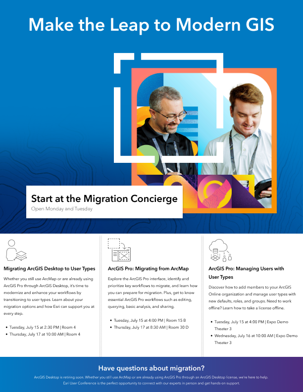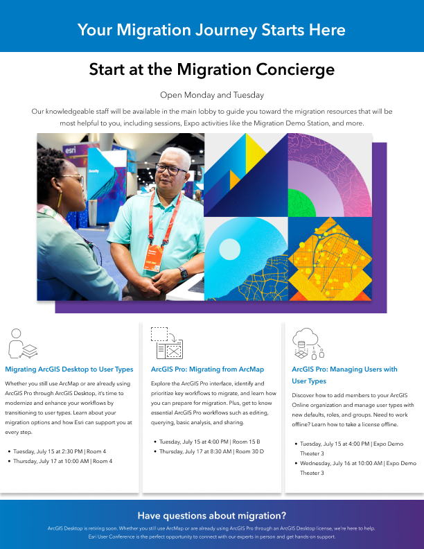 This flyer was designed for the Esri 2025 User Conference to promote the ArcGIS Desktop Migration Campaign. The flyer was distributed to user conference attendees. The goal of this flyer is to provide customers with resources and information about the migration process at the conference.